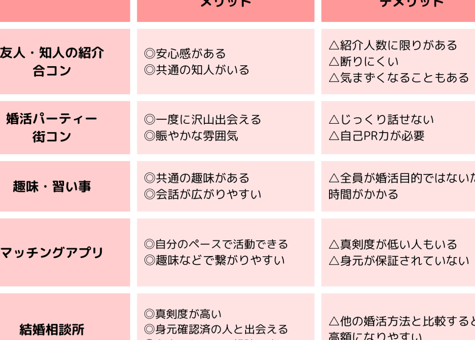 - 友人や知人を通じて出会う。社会的なつながりを大切にし、紹介を受ける機会を増やす。