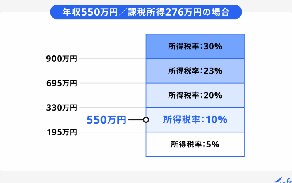 所得税率は累進課税方式に基づいて設定されています。所得が増加するほど、適用される税率も高くなります。以下のように税率が段階的に設定されています。