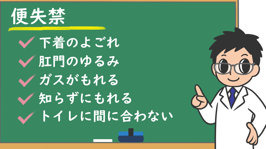 - 不随意排便:トイレに間に合わず、便が漏れることがある。