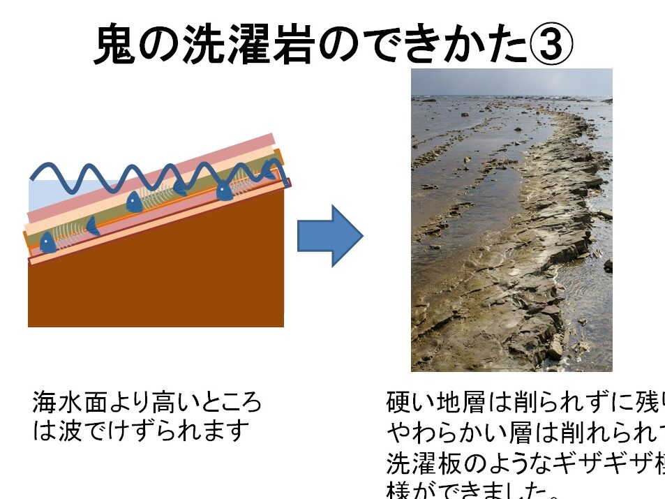 - 鬼の洗濯板の凹凸で衣類をこすり、汚れを落とす。