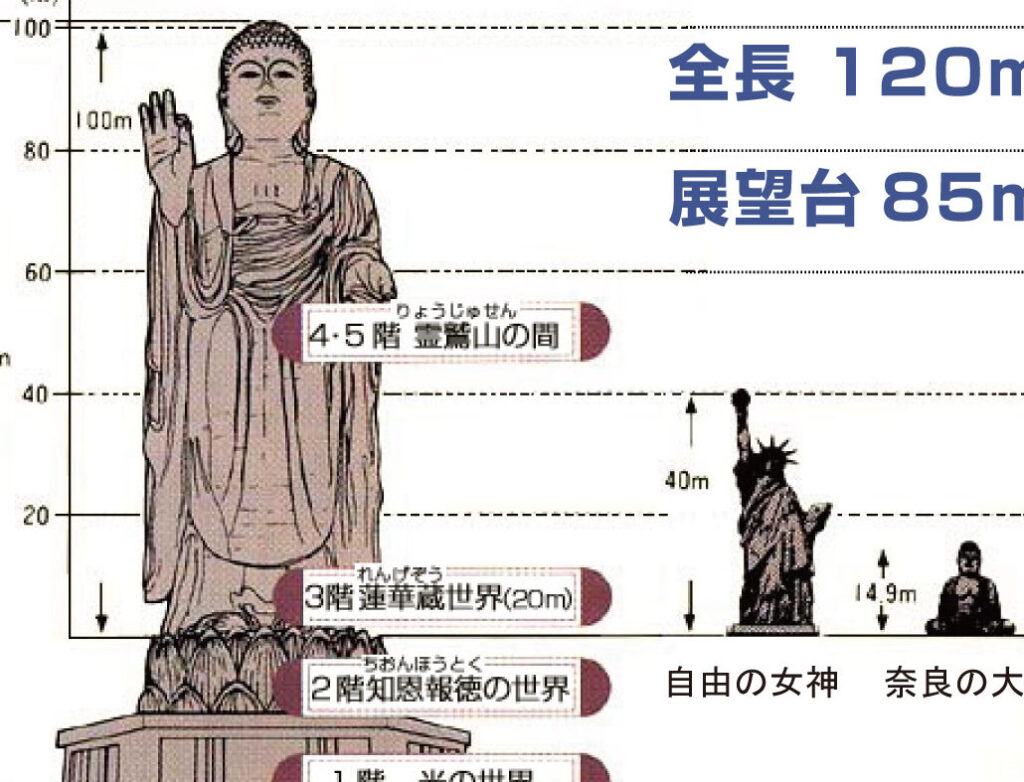 牛久大仏は1980年に建設が始まり、1993年に完成しました。その高さは120メートルで、全体の重さは約4,000トンに及びます。私たちがこの仏像を作るために技術と労力を投入したことは特筆すべき点です。