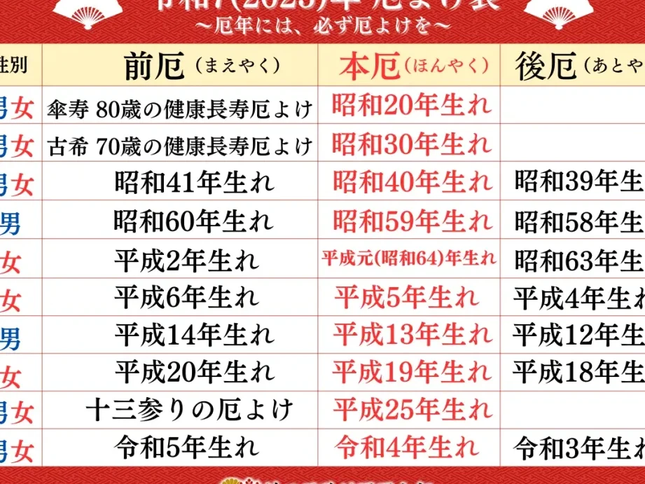 - 一般的な厄年の基準を参考にします。例えば、男性は33歳、42歳、61歳、女性は19歳、33歳、37歳、61歳が厄年とされます。