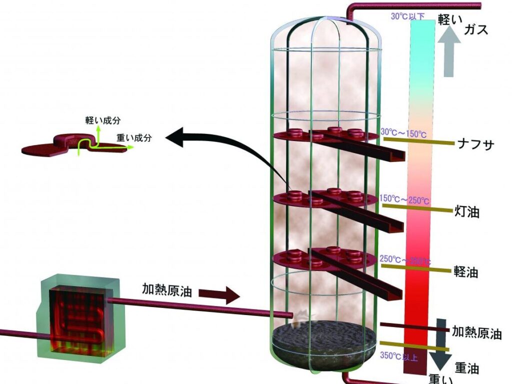 加熱された原油を蒸留塔に送り、異なる成分に分離します。これにより、ガソリンや他の石油製品が得られます。