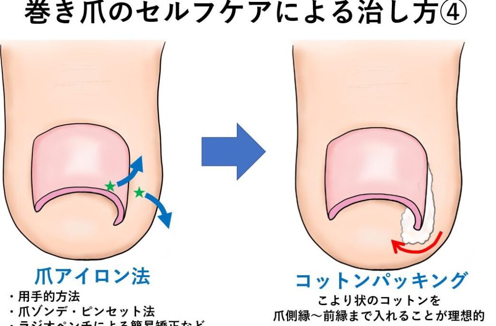 巻き爪の治療法には、自宅で行える方法と医療機関での施術があります。私たちはそれぞれのアプローチについて具体的に見ていきます。