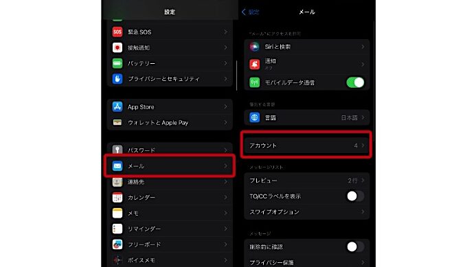 - 「メール」をタップしてメール関連の設定を開きます。