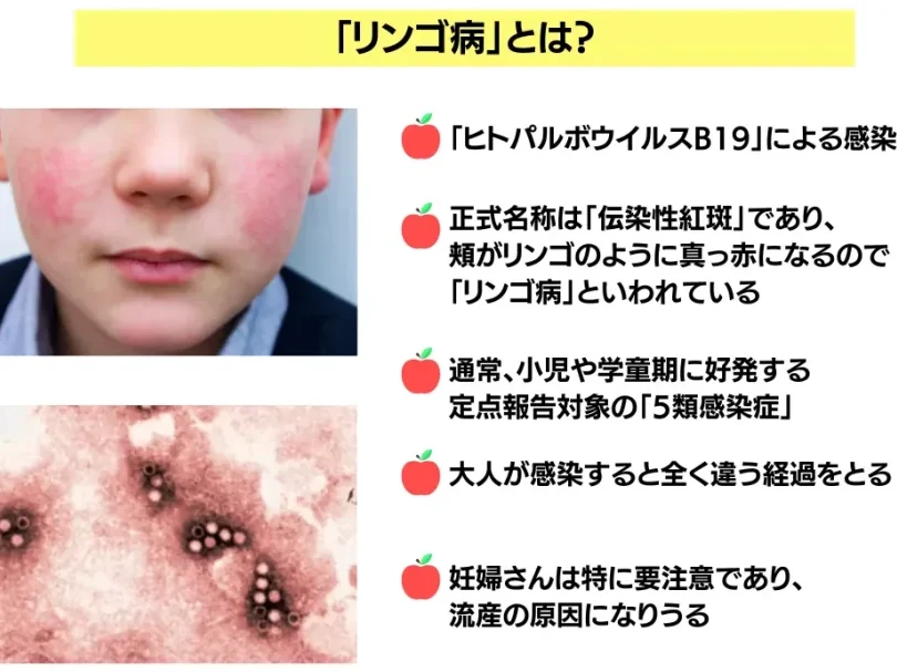 りんご病は、特に子どもに見られるウイルス性の感染症です。この病気は、パルボウイルスB19によって引き起こされます。感染者は、強い感染力を持ち、接触や飛沫を通じて他の人に感染することがあります。