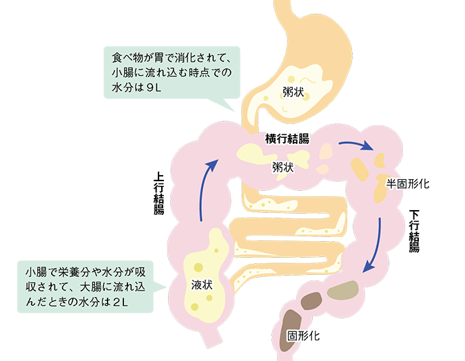 - 不要物を分離する。 大腸に行くと、吸収されなかった部分が別れ、不必要な水分が再吸収されます。