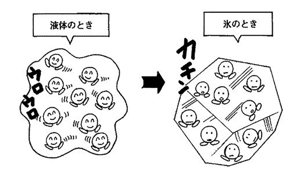 氷は固体の水です。温度が0℃以下に下がると、水分子が結びつき始め、結晶構造を形成します。この過程で、分子の運動が遅くなり、しっかりと固定されます。