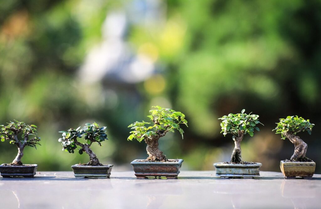 - 限られた場所に設置:小さな盆栽は、机の上やシェルフに簡単に置けます。