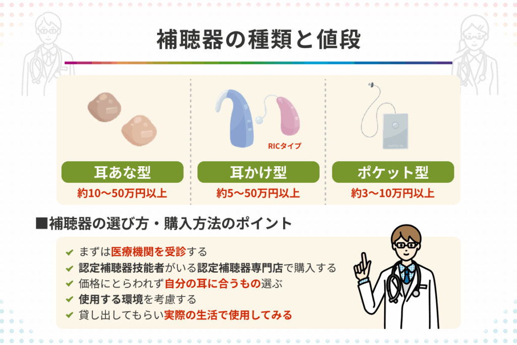 - 価格帯を調べる。補聴器の価格は、数万円から数十万円まで幅広いです。