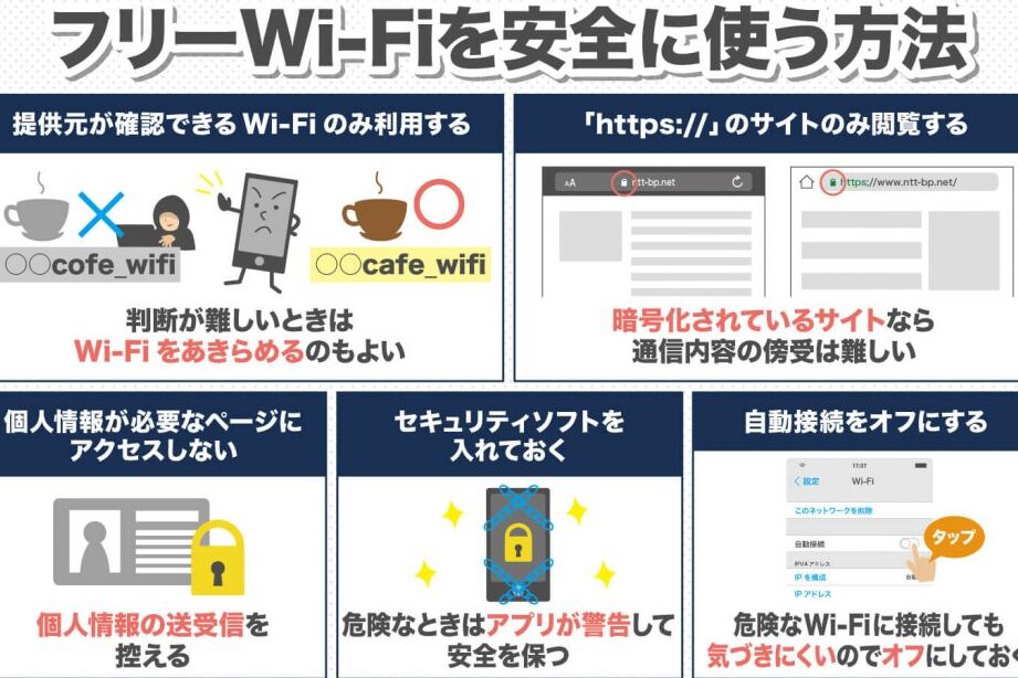 - 公衆Wi-Fiのリスクを理解する。 セキュリティが低いため、個人情報の漏洩に注意が必要です。