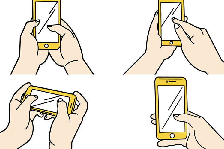 - スマホを片手でしっかりと握る。 落とさないように、親指で背面を支える。