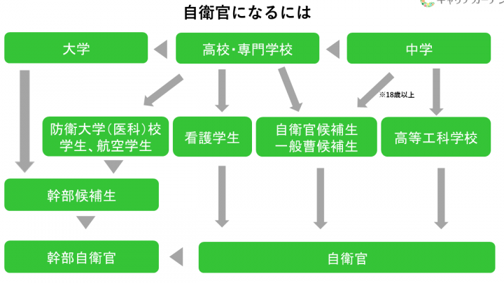 - 大卒または専門学校卒: 幹部候補生の場合、大卒または専門学校卒業が必須となります。