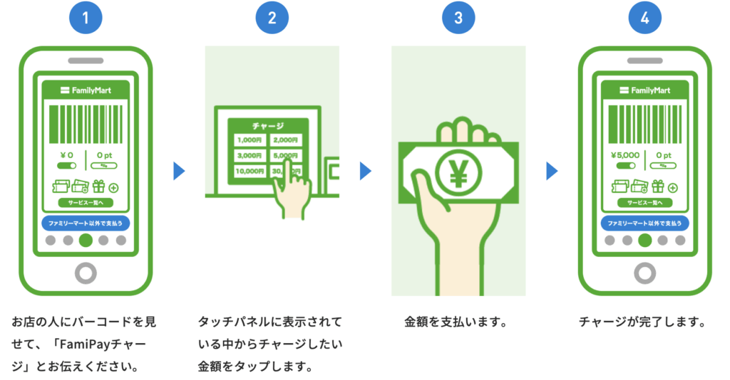 店舗利用時には事前にファミペイアプリ内で残高をチャージしておく必要があります。主なチャージ方法として以下があります: