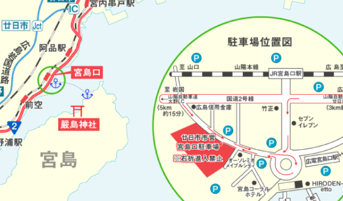 - 宮島口には駐車場があり、有料となります。