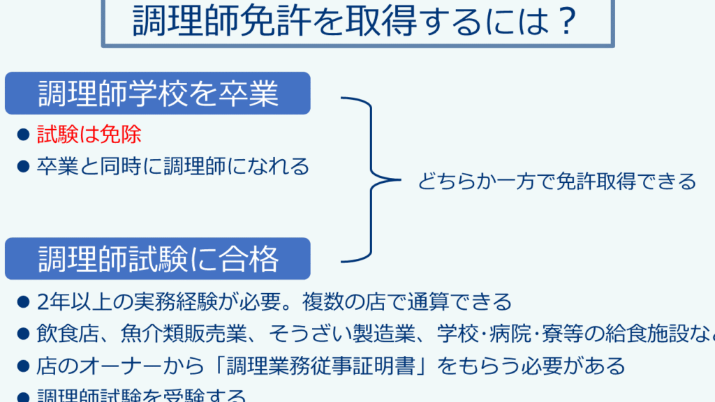 - 実務経験: 調理業界で2年以上の実務経験が必要(専門学校などで学んだ場合は短縮可)。