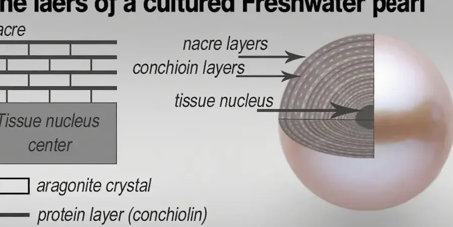 刺激物が体内に入り込むと、貝殻はそれを包み込むためにナカイ層という特殊な物質を分泌します。このナカイ層は主成分としてカルシウム炭酸塩と有機質から構成されており、一枚一枚重ねられていくことで徐々に真珠が形作られます。