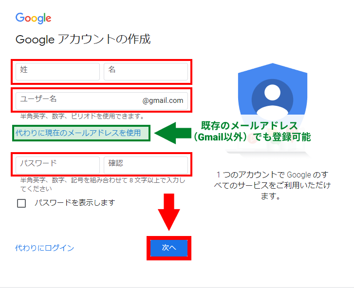 * ユーザー名:希望するメールアドレス(@gmail.com)の部分です。他のユーザーと重複しないものを選ぶ必要があります。