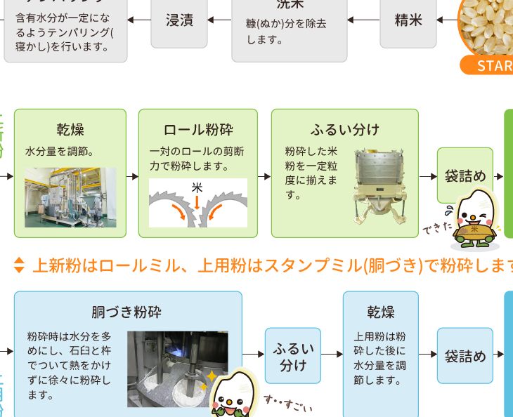 このように、それぞれ異なる技術によって私たちは多種多様な「米粉」を生産しています。それぞれの工程は連動しているため、一つでも疎かになると品質に大きく影響します。そのため、このプロセス全体を見ることが重要なのです。次章では「品質管理と米粉の保存方法」について詳しく解説します。