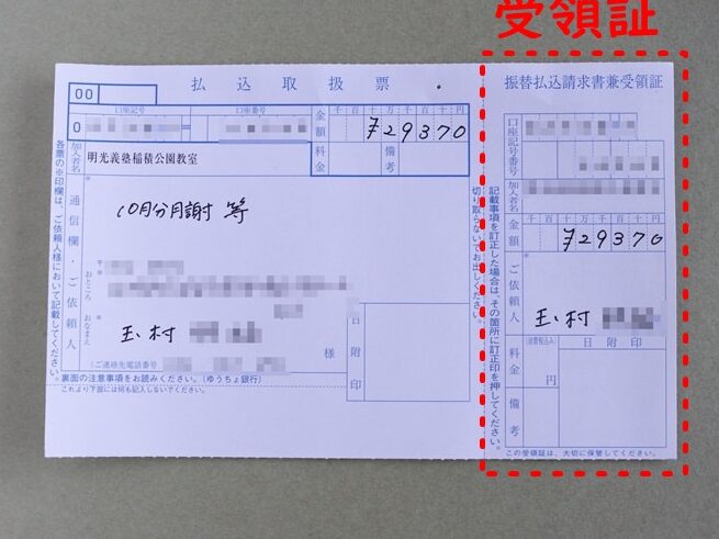 払込取扱票には必要な情報(振込先口座番号や金額)が記載されていますので、必ず確認しましょう。