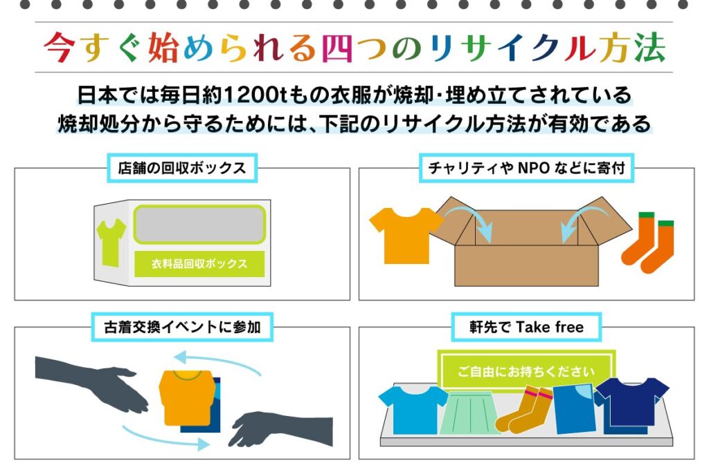 これら小さな意識改革が積み重ねられることで、大きな変化につながります。服どうやって捨てるかという問いだけでなく、その背後には広範囲な環境問題への対策も含まれていることをご理解いただければと思います。