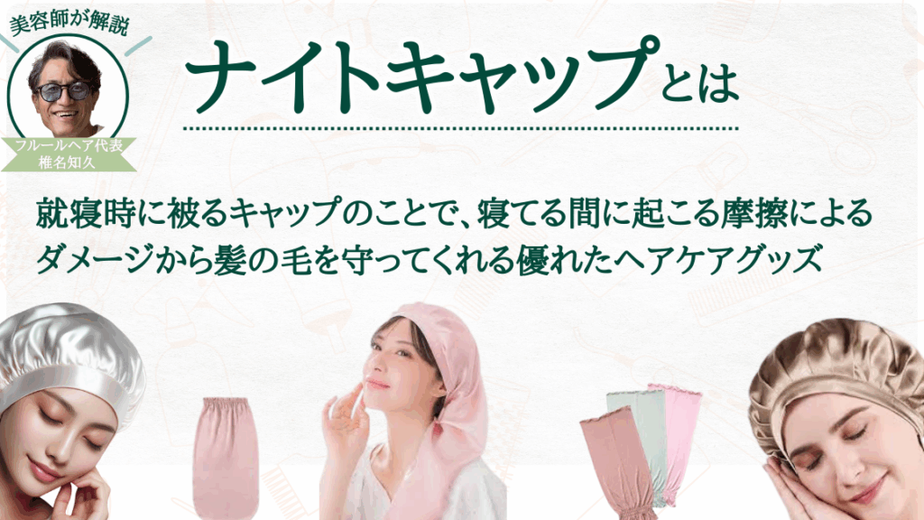 - ナイトキャップ: ナイトキャップを使用することで、髪が動く際の摩擦から守ることができます。