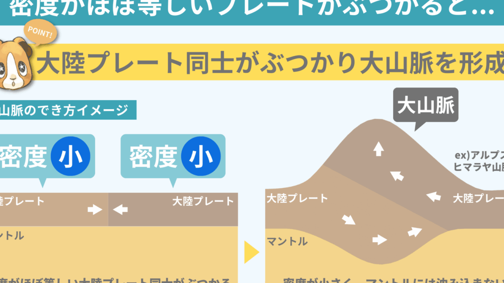 - 地殻の厚み増加: 衝突によってインドプレートが押し上げられ、その結果として地殻が厚くなります。これは高い山岳地域を形成するための基盤となります。