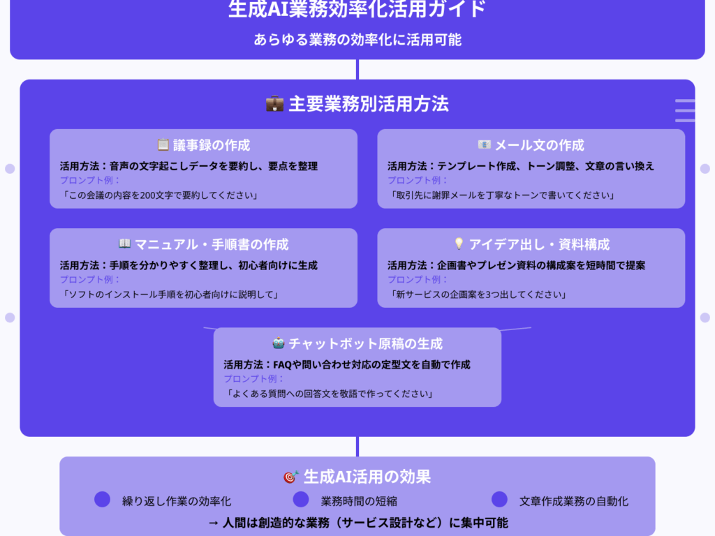 - 効率的なリソース管理: 生成AIは業務プロセスを見直し、自動化できる部分を特定することで、人手不足やコスト削減への対応策として機能します。このような自動化は、生産性向上にも寄与します。