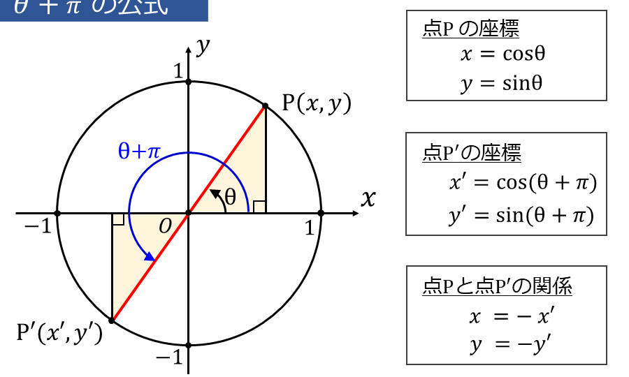 これらは単位円や直角三角形を基にした簡単な公式で表現できます。例えば、θ(シータ)が与えられた場合、これらの値は次のようになります: