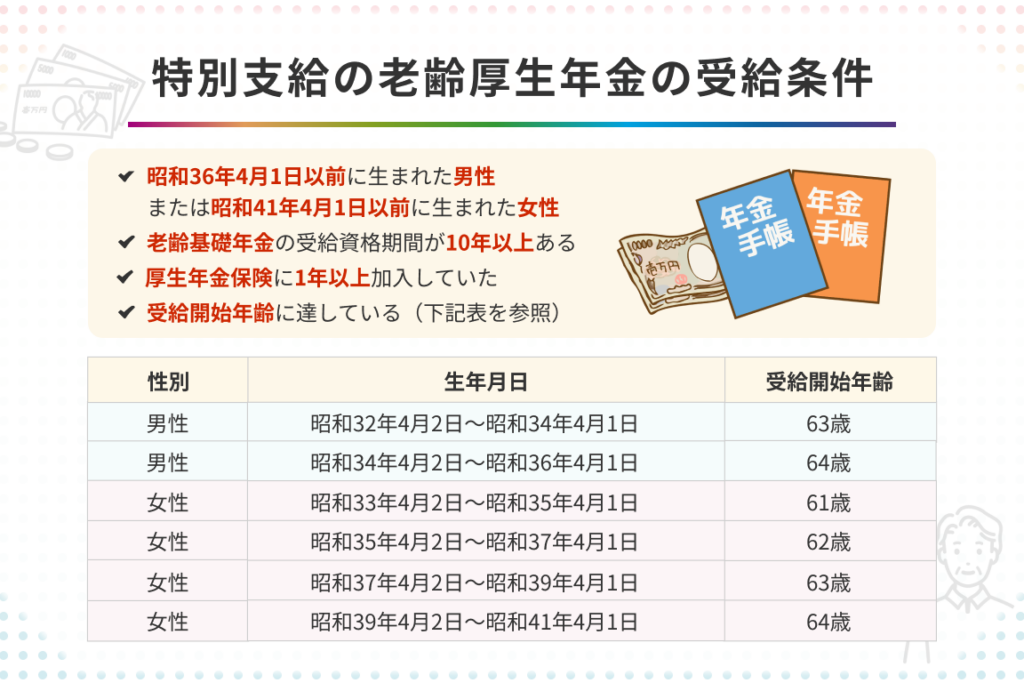 特別支給の老齢厚生年金は、一定の条件を満たす方のみが対象です。具体的には、厚生年金への加入期間や収入状況などが考慮されます。