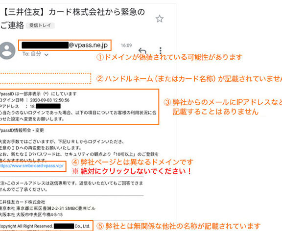 以下に、三井住友カードのフィッシングメールでよく見られる特徴を示します: