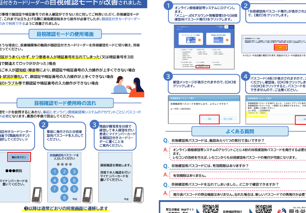 このような特徴から、目視確認モードは多くの場合、従来の対面式資格確認よりも効率的です。また、高齢者やテクノロジーへの不安を抱える方々にも配慮された設計となっています。私たちはこのモードのおかげで、多様なニーズに応じた柔軟な資格確認手段を利用できるようになりました。