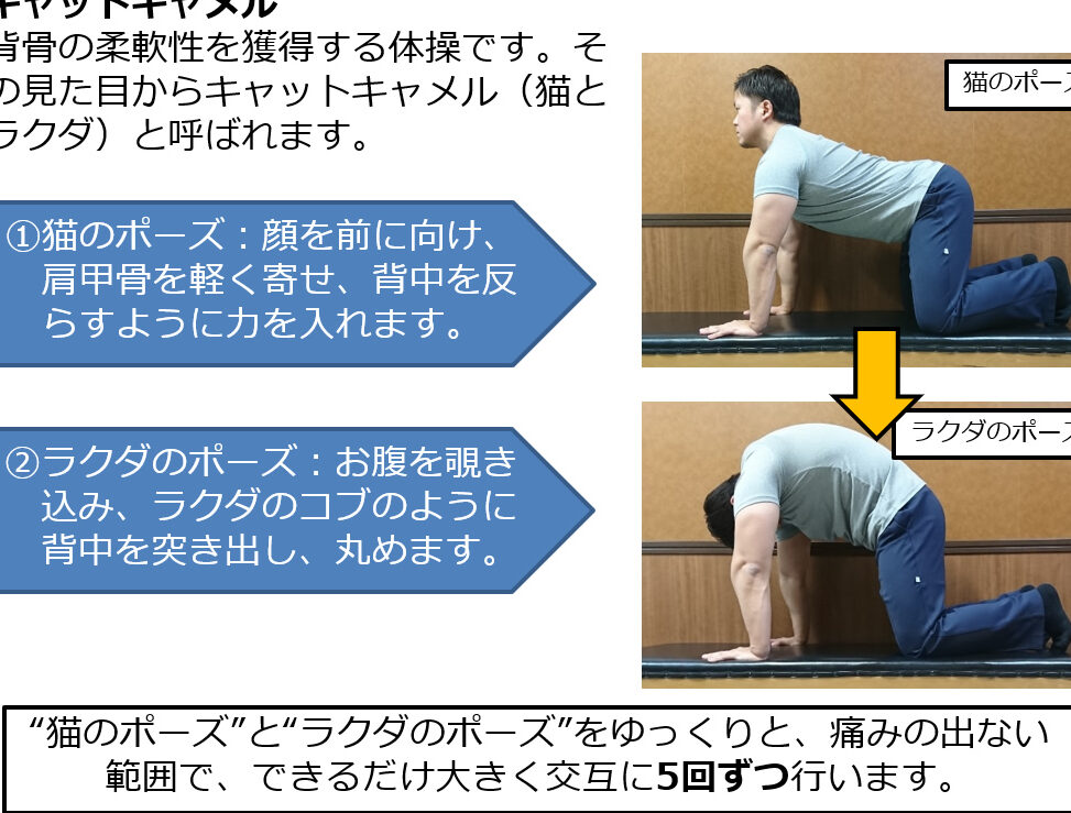 - 猫背伸ばし: 四つん這いになり、お腹を下へ向けながら背中を反らせ、その後丸めます。