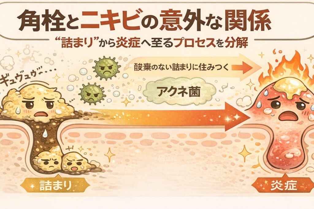 - ニキビ形成: 毛穴内でアクネ菌が繁殖しやすくなることで炎症を引き起こし、赤みや腫れを伴うニキビとなります。
