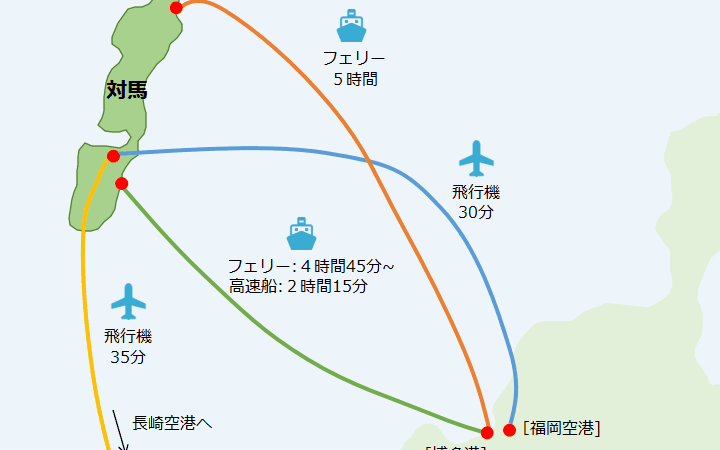 また、航空機も非常に便利な選択肢です。特に東京や大阪など大都市圏から直行便があり、多くの場合、早朝便や夕方便もあります。この場合、空港から対馬市内へのアクセスも簡単です。