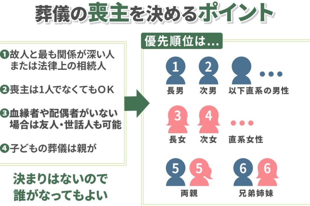 喪主には、その故人との関係性が重要です。一般的には、以下のような基準で選ばれます。
