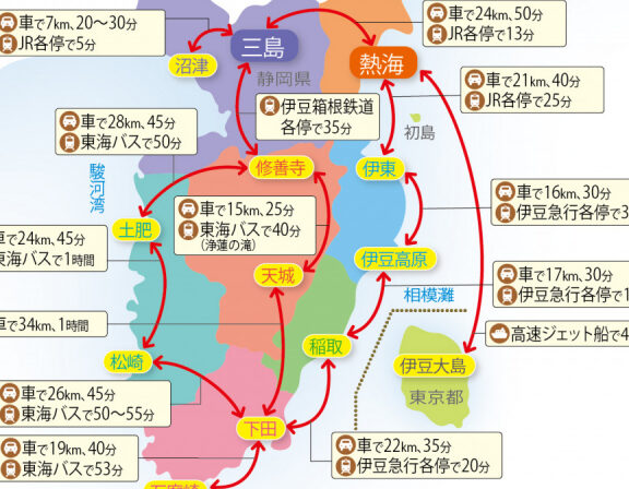 | 静岡市 | 新東名高速道路 → 伊豆縦貫自動車道 → 熱海ビーチライン | 約1時間20分〜1時間50分 |