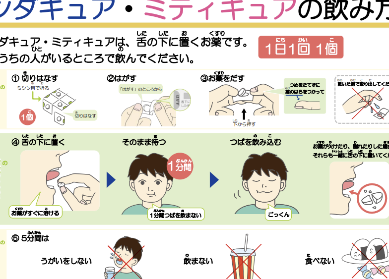 - 薬剤の準備: 処方された舌下免疫薬は、清潔な場所で取り出し、手洗いをした後に使用します。開封した薬剤は、その日の内に使用し、不明な場合は再度医師に相談してください。