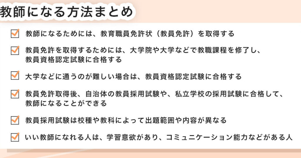 次に、教師になるために必要となる具体的な条件について考えてみましょう。主に以下のようなものがあります: