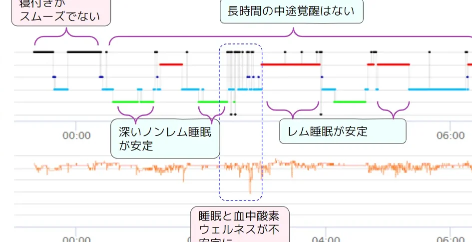 - 中途覚醒: 何回目覚めているか、その時間帯も分析することで、問題点が見えてきます。