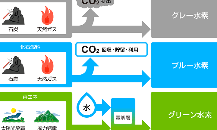 - 電気分解: 水を電気分解して水素と酸素に分解する技術です。このプロセスでは再生可能エネルギー(太陽光や風力など)を使用することで、温室効果ガス排出ゼロの水素を生成できます。