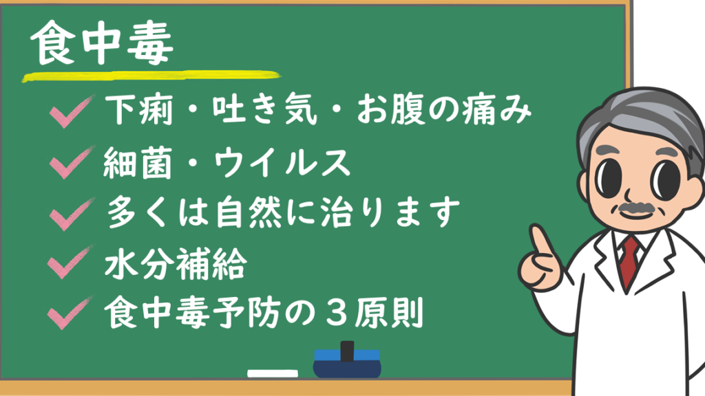 - 食事内容: 最近摂取した食品について思い出し、不衛生だったり疑わしいものはないか振り返ってみましょう。