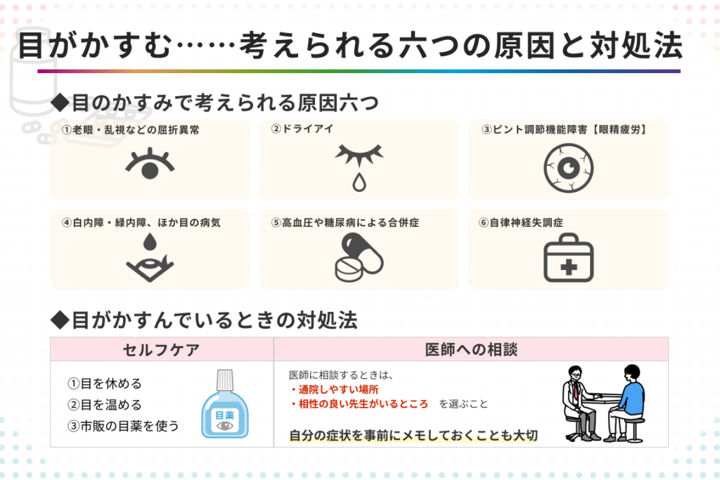 - 糖尿病性網膜症、高血圧など、一部の疾患も目のかすみに寄与することがあります。