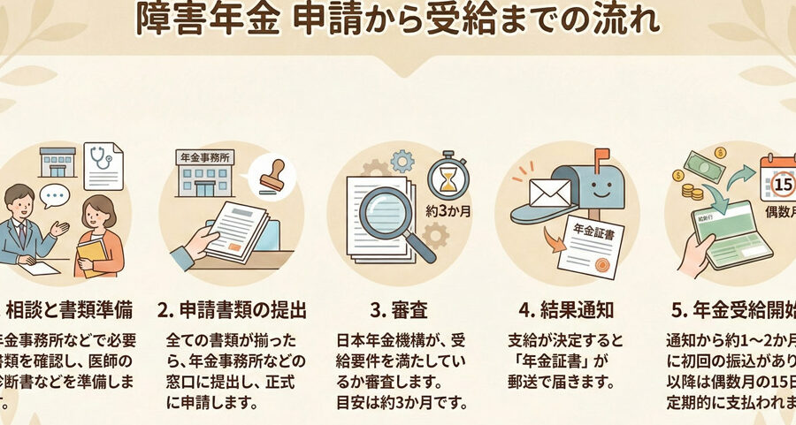 障害者年金の申し込み後、以下のような流れで手続きが進行します: