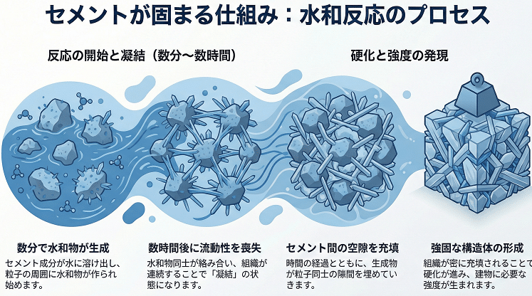 - 水: セメントとの化学反応によって硬化させるため必要。