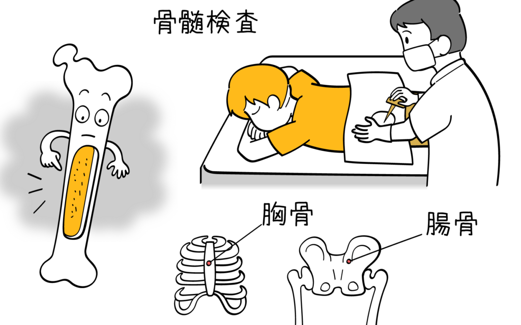 次に実施される可能性が高いのは骨髄穿刺(こつずいせんし)です。この手技では、小さな針を使って骨髄から細胞を採取します。採取したサンプルは顕微鏡で詳細に分析され、白血病細胞が存在するかどうかを確認します。