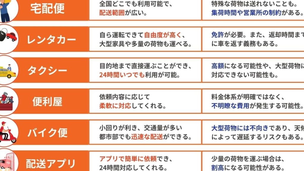 - バイク: 短距離の迅速な配達に特化しており、市街地での機動性があります。小型荷物や緊急配送に向いていますが、一度に運べる量は限られています。