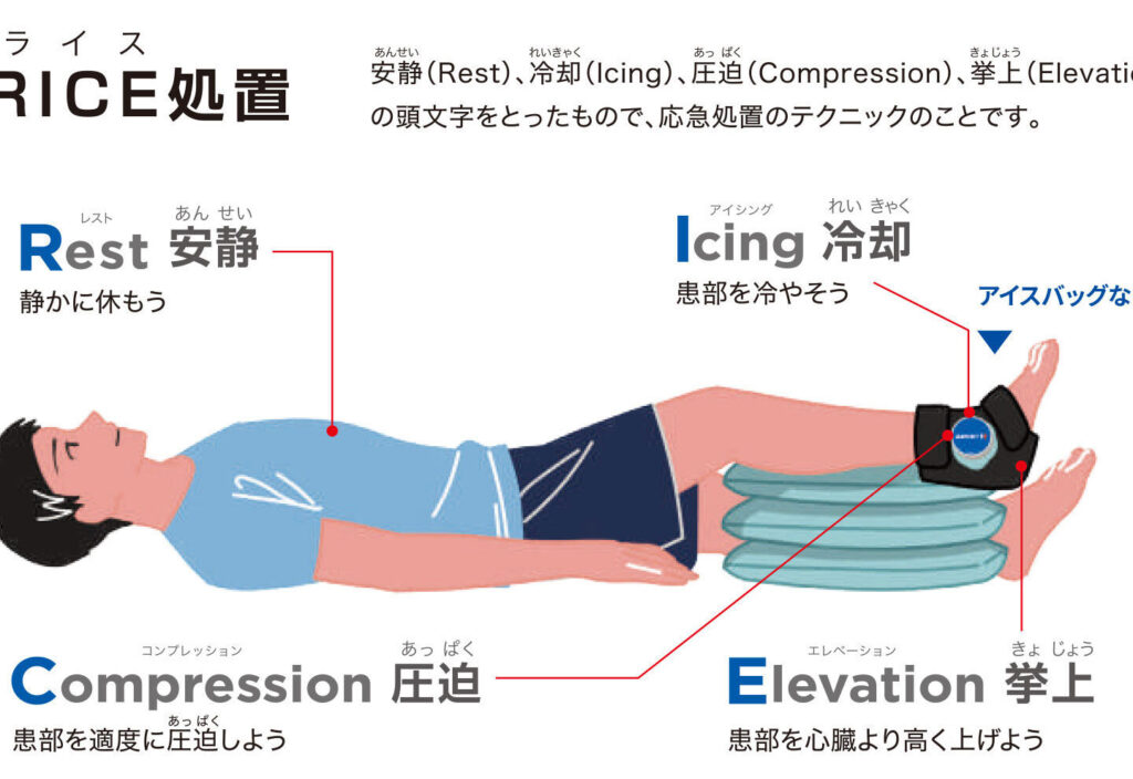 応急処置の基本として広く知られている方法が「RICE法」です。この方法は以下の4つのステップから成り立っています: