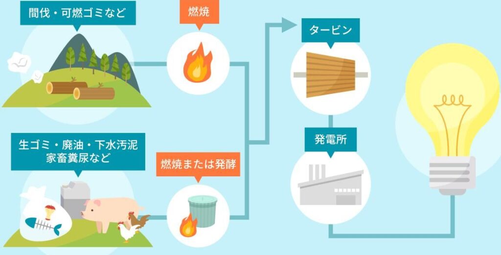 - 発酵: 微生物によって有機物からメタンガスやアルコールなどの可燃性ガスへ変換し、それらを利用して発電します。