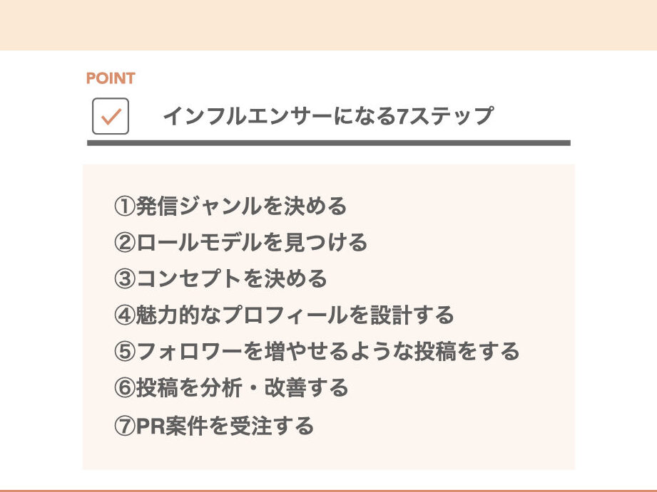 これらすべてのステップは連動しており、一つ一つ丁寧に進めることでインフルエンサーとして成長していきます。